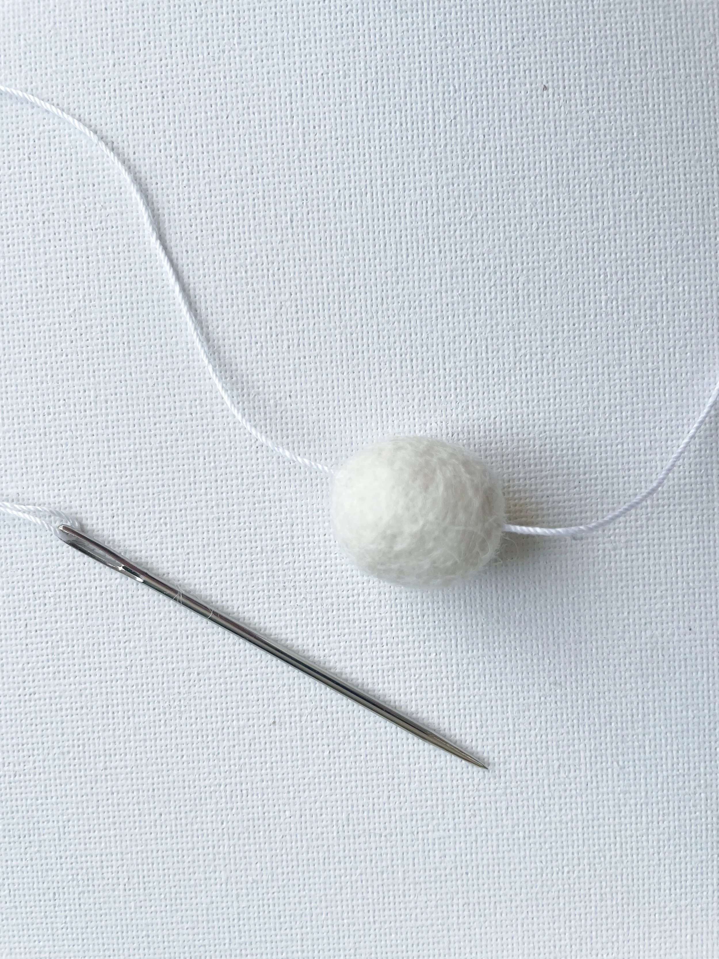 Take your first felt ball and carefully begin threading it onto the string. Sometimes it can be a little fiddly to push the needle all the way through the felt.