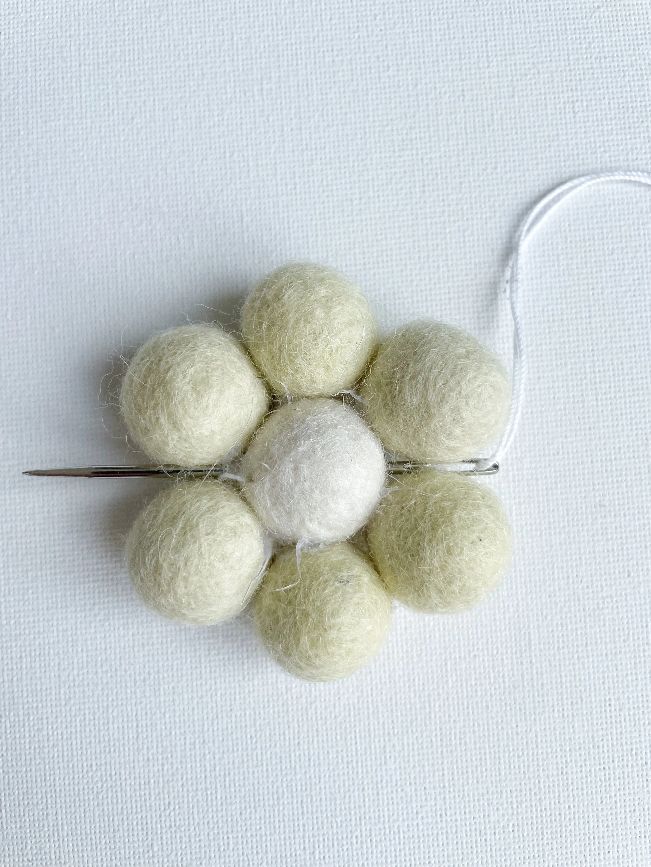 Each daisy is made from seven felt balls, so first decide how many daisies you’d like on your garland (I think odd numbers always look the most pleasing).