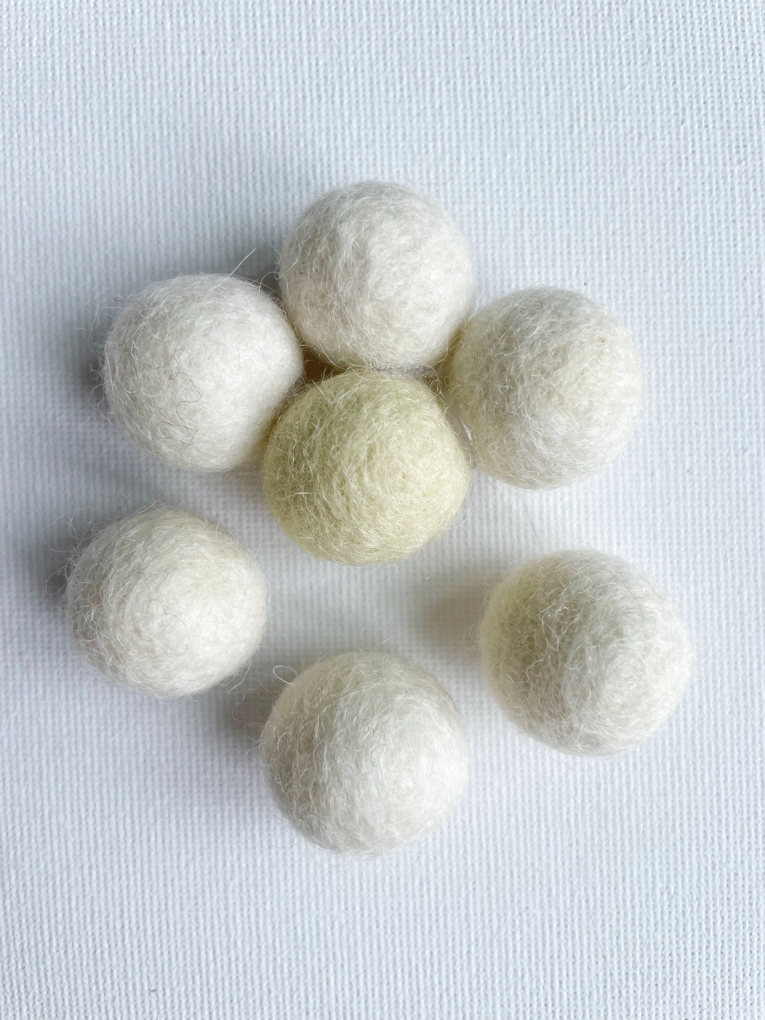 For each daisy, you’ll need seven felt balls. If you’re following my colours, that’s six ivory and one pale yellow, or vice versa. Place the yellow ball in the middle, then arrange the ivory balls around it to form a sweet little daisy shape.