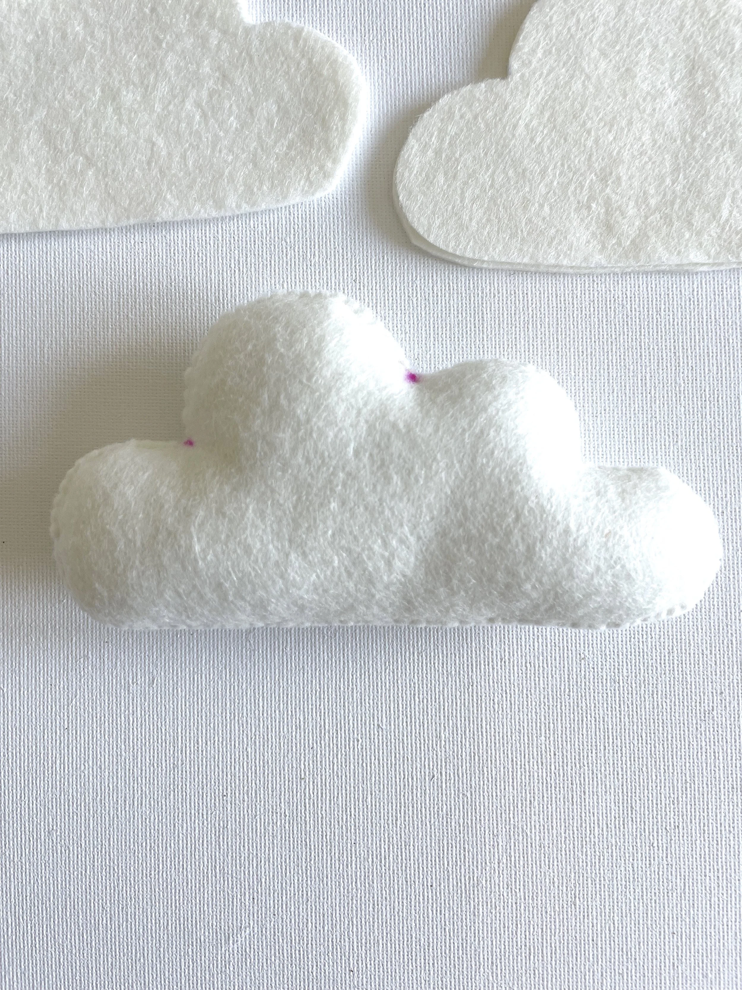 Sew up the gap at the top of cloud. Add the last bit of stuffing before the final stitches are added. Repeat this until all of the clouds are sewn.