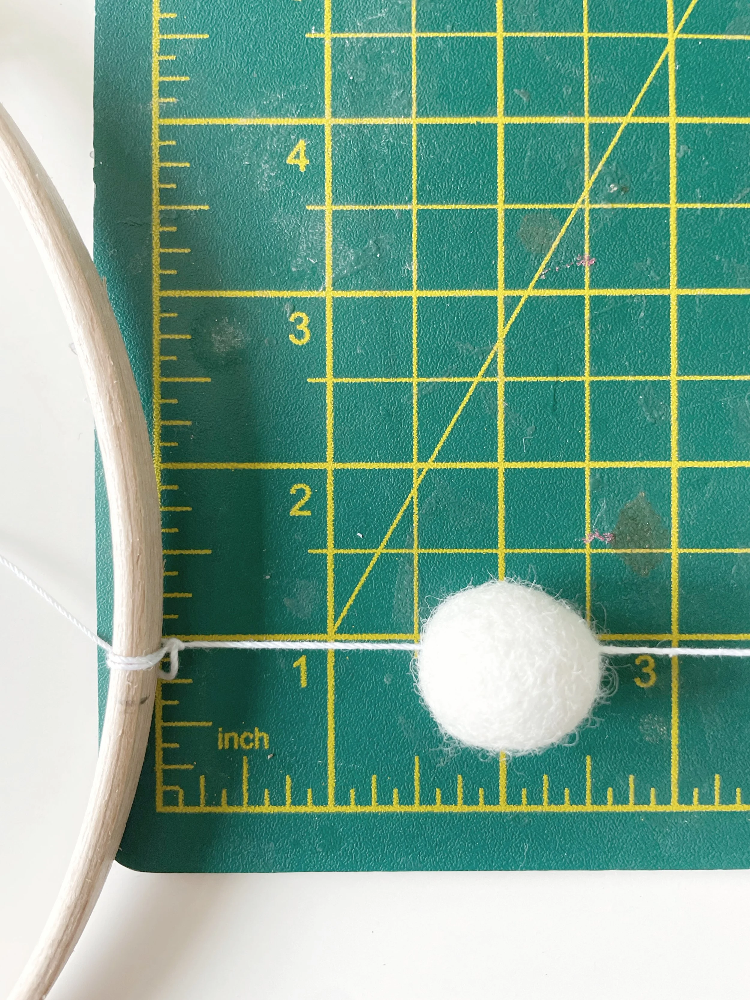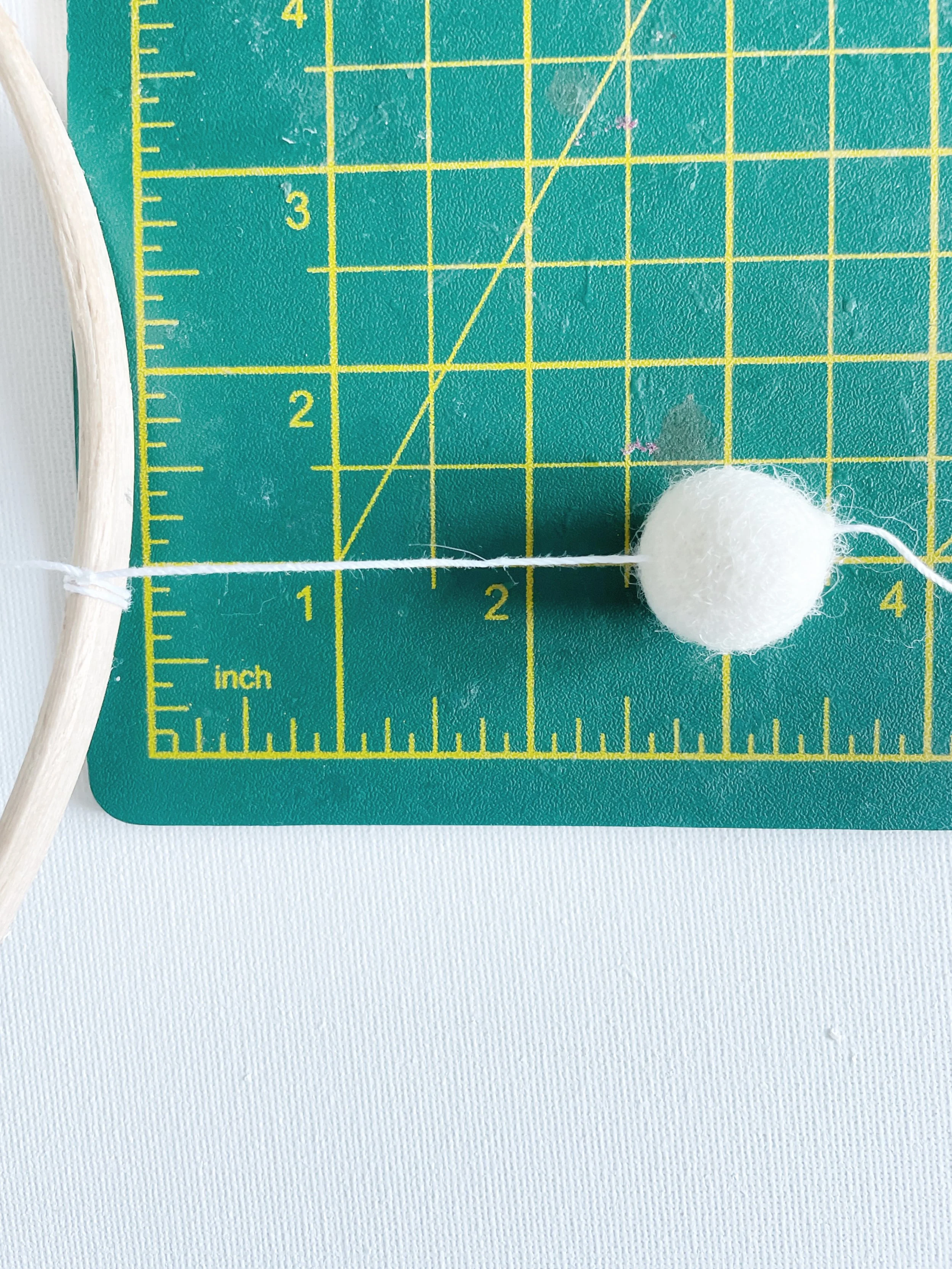 Let’s start by attaching the first felt ball (if you’re using one). Thread your large needle with one of the strands of string, then gently slide the felt ball onto the string. Position it so it sits 2.5 inches below the top of the beech ring. (You can refer to the picture above for a visual!).
