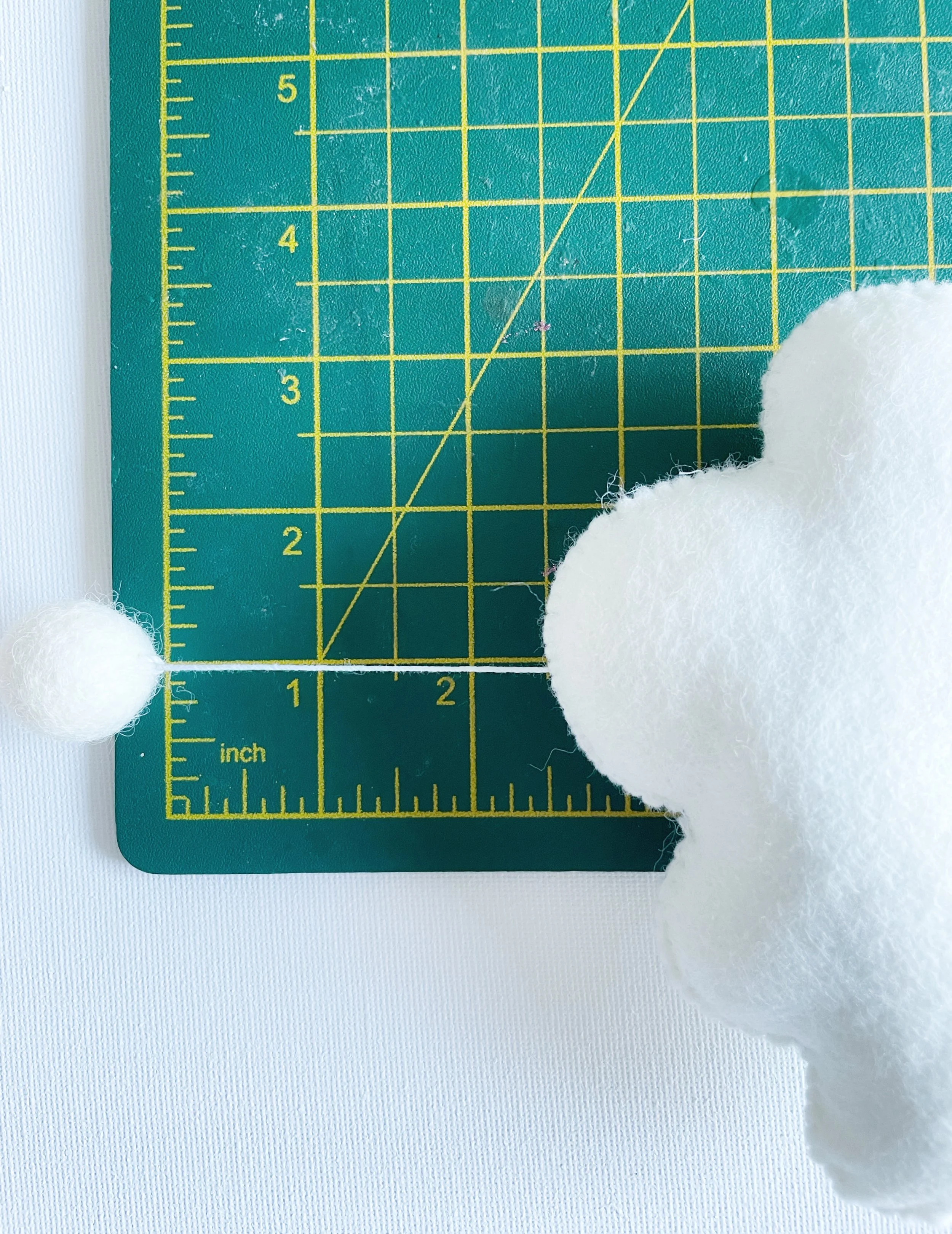 Now, thread a cloud onto the string. Position it so it’s 2.5 inches below the felt ball you just added, and secure it with another knot.
