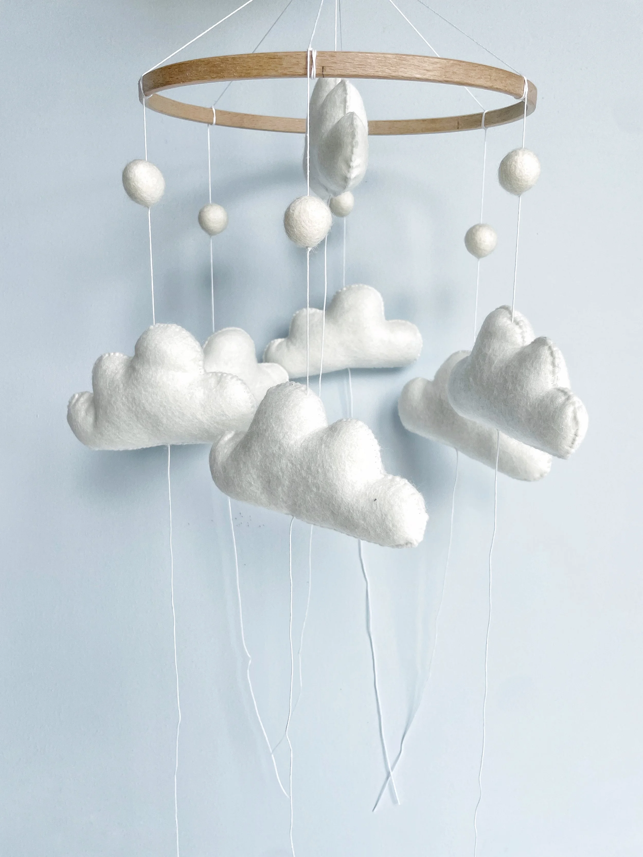 As soon as your little one can stand or pull themselves up, it’s time to take the mobile down. You can tuck it away as a keepsake, save it for your next little bundle, or even repurpose it into a gorgeous cloud garland! You can make it here.