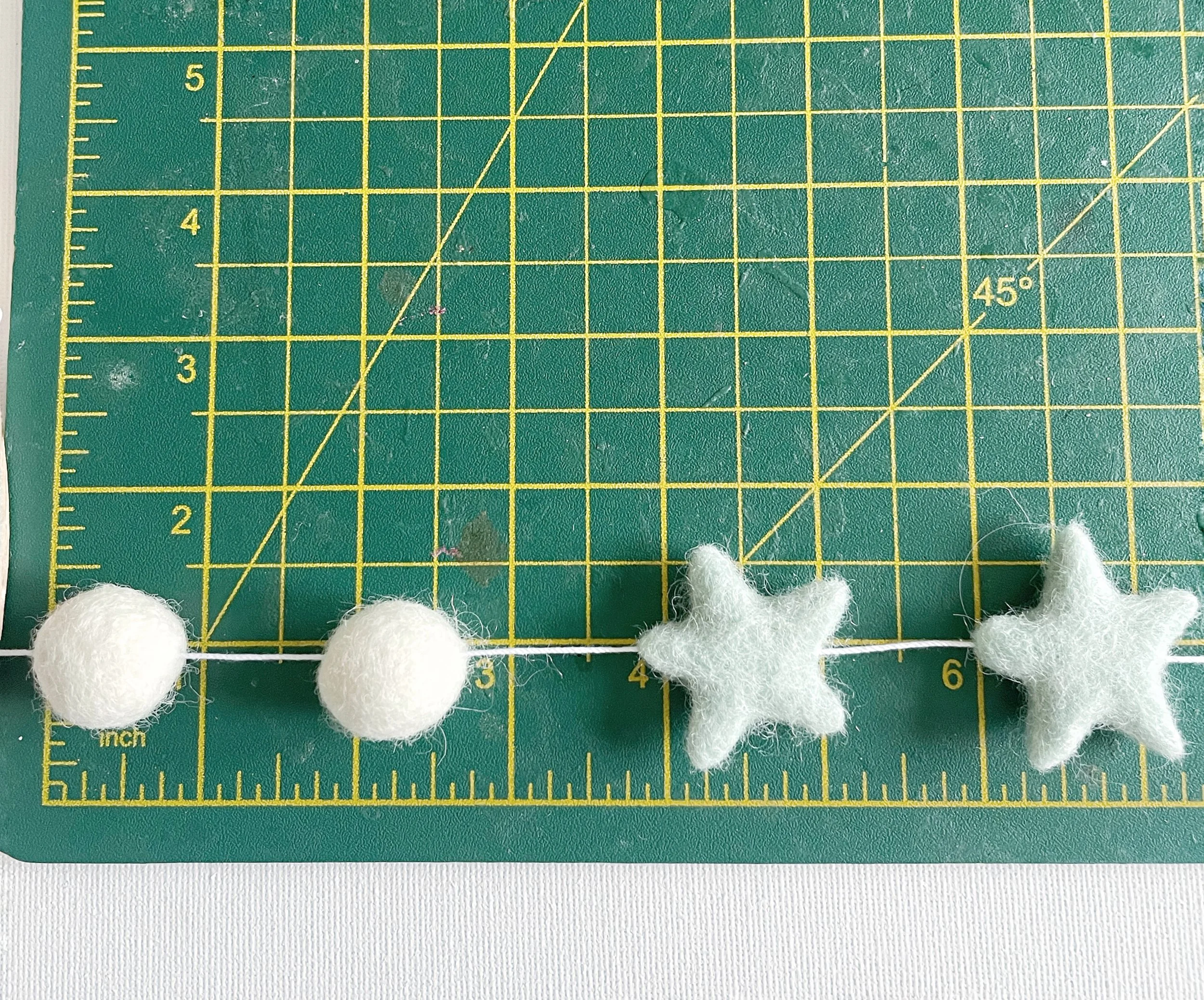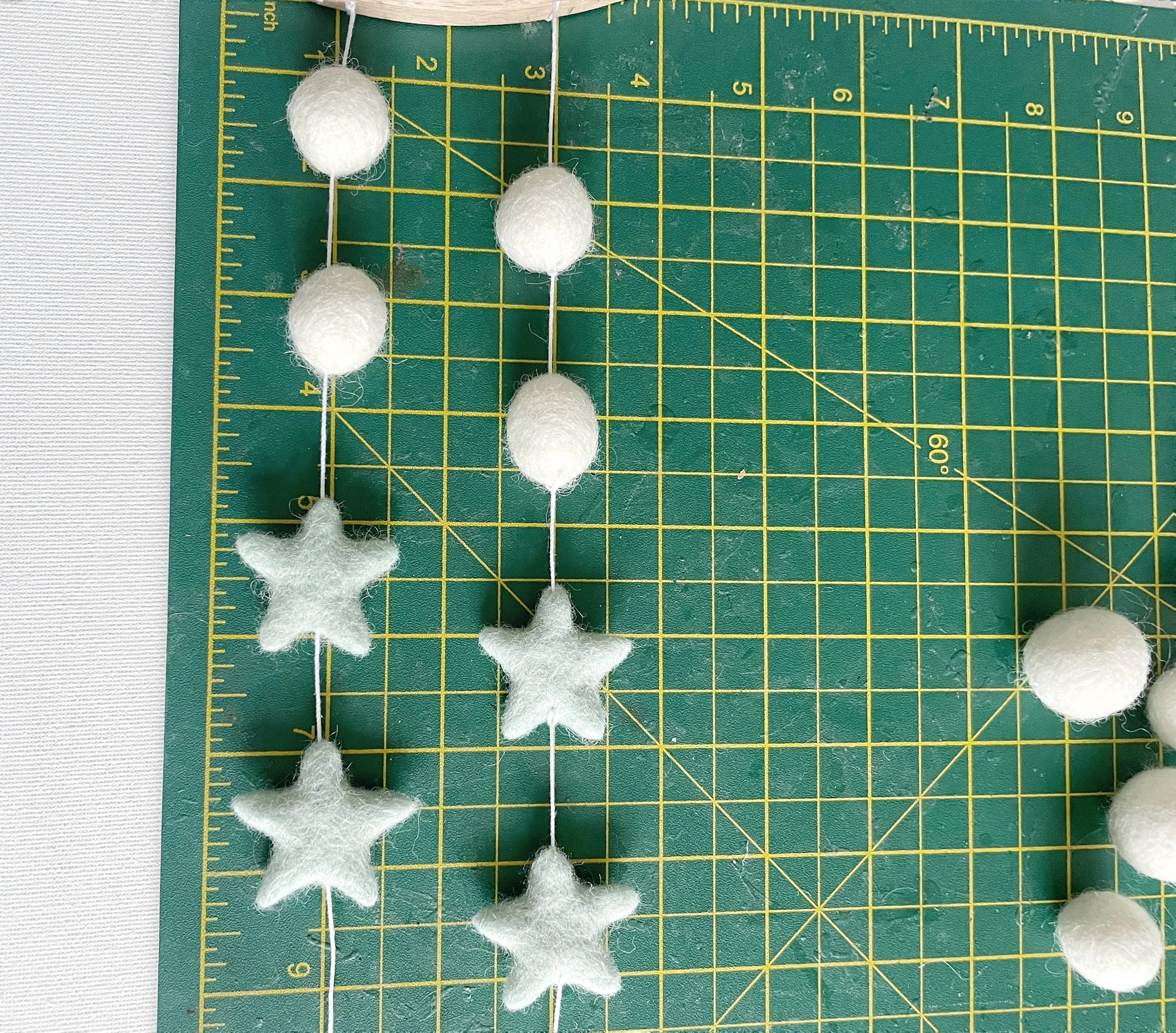 You’ll notice that by staggering your measurements, the next strand of felt balls and stars will naturally fall into the little spaces between the ones on the strand before it.