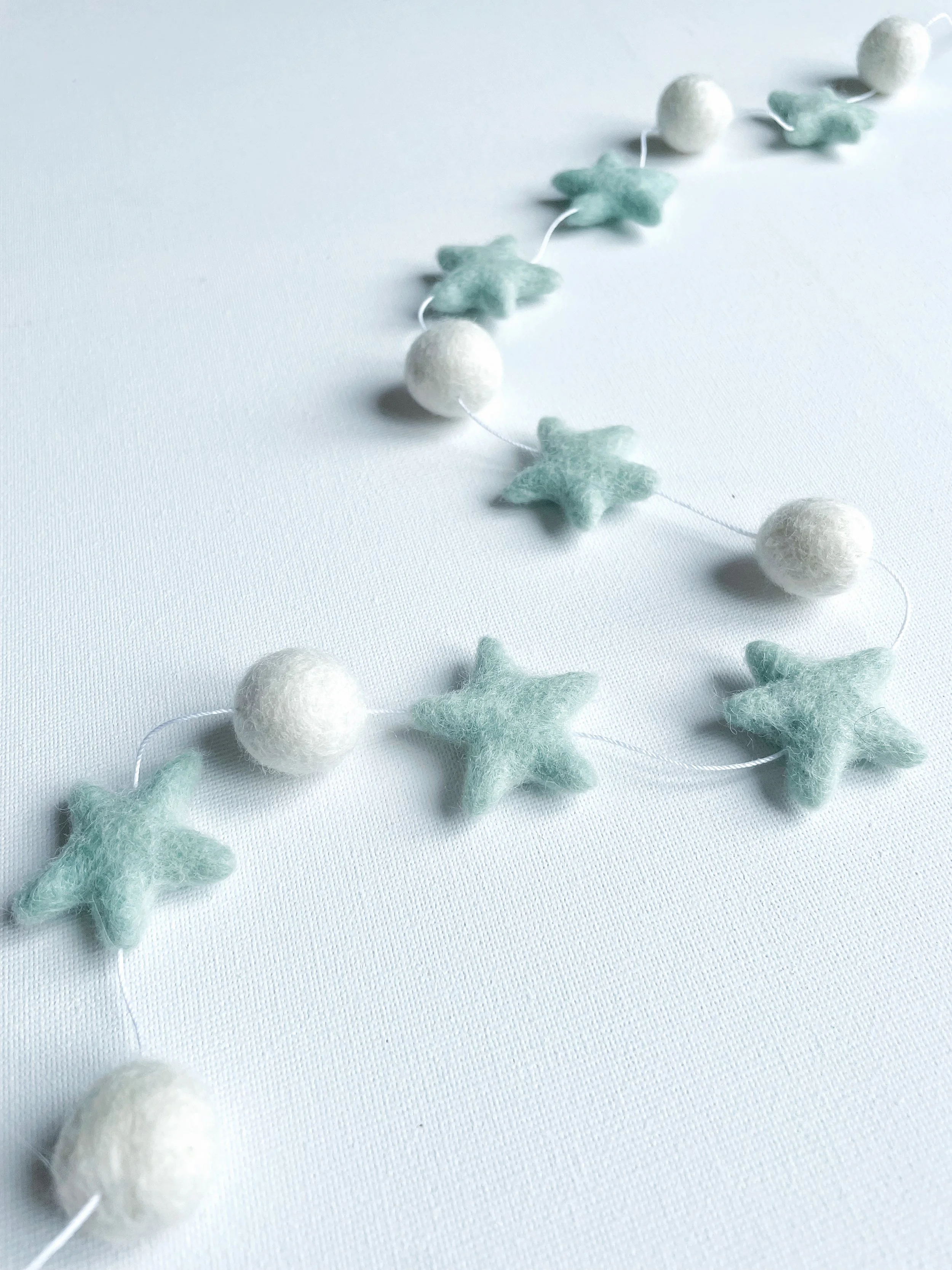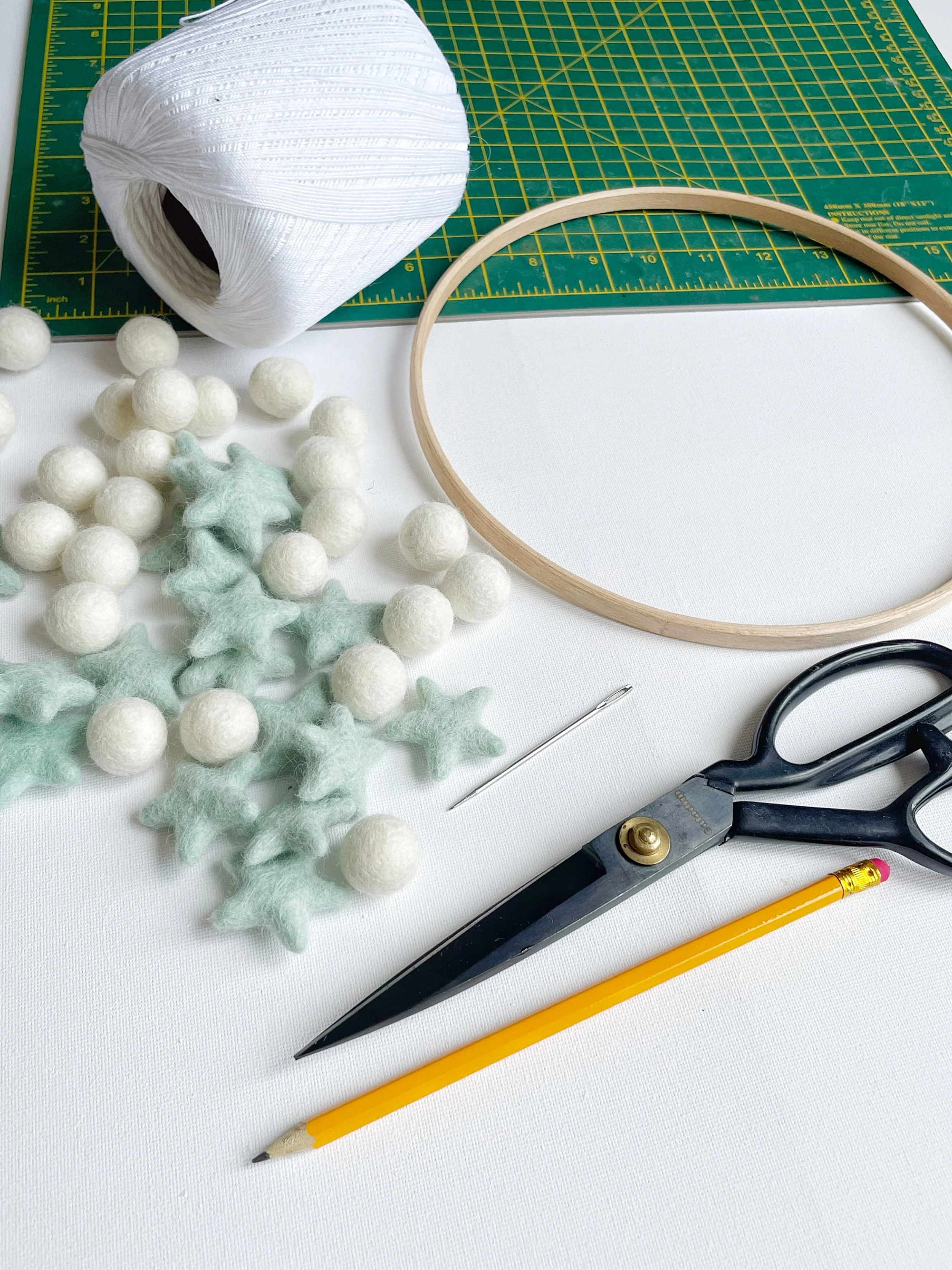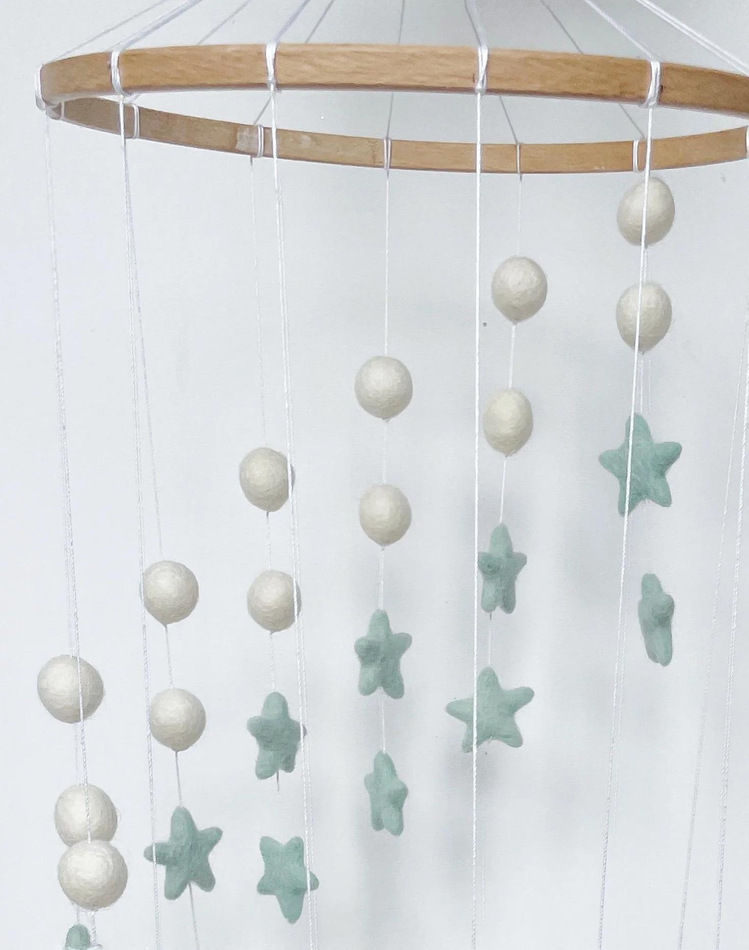For my version, I chose ivory felt balls with mint green stars for a soft, gender-neutral look. But that’s the beauty of this project, you can have fun playing with colours.