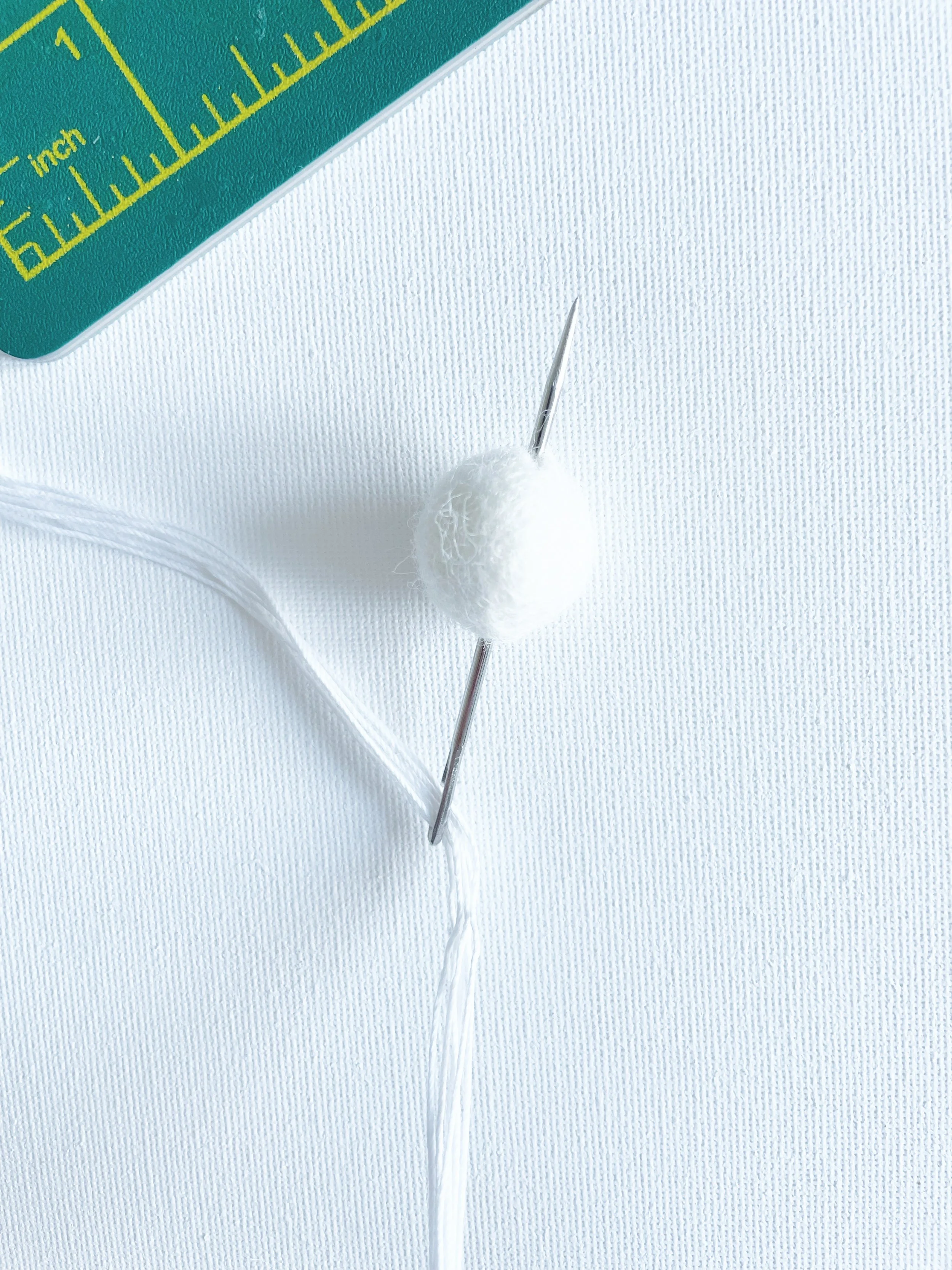 Here’s a handy little trick: stand the blunt end of your needle on your cutting mat (or any hard surface), then gently press the felt ball down onto the needle with your fingers. This way you’ve got more control, and the ball will slide on much more easily.