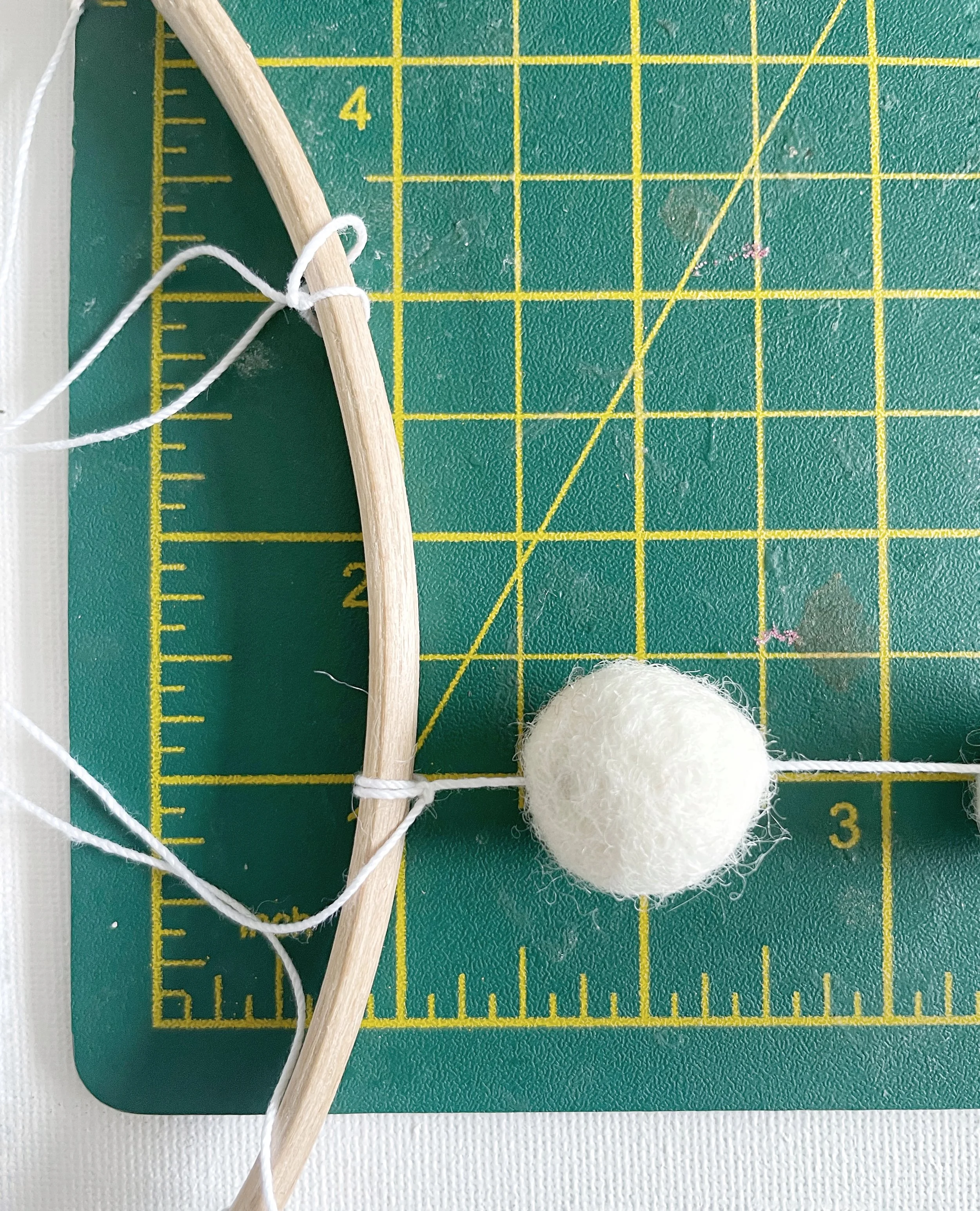Take your next piece of string and thread on a felt ball, sliding it down until it sits exactly 1 inch from the top of the wooden hoop.