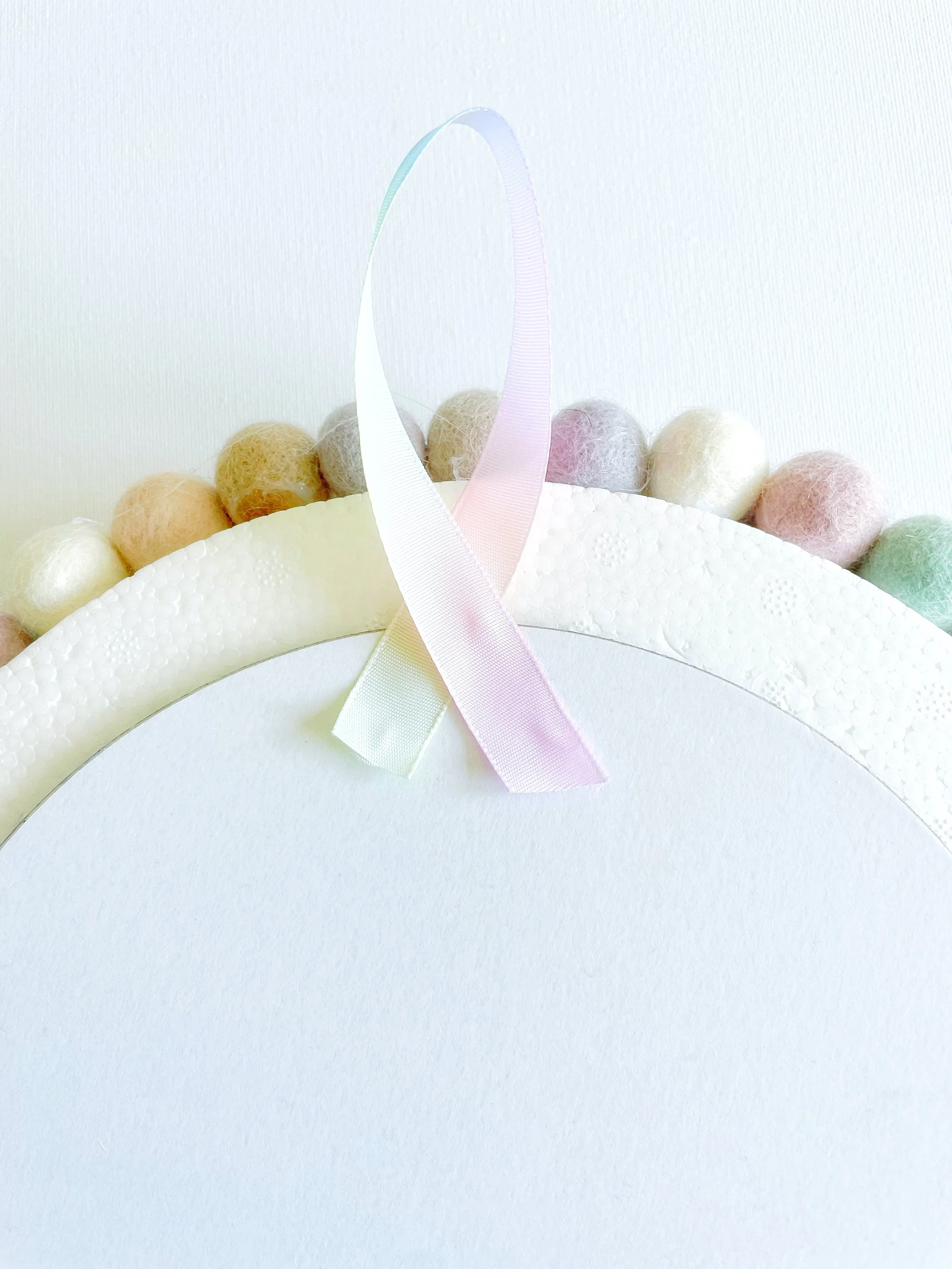 If you're going for a classic felt ball wreath, the next step is to add a hook. I like to use ribbon for this, so follow along with the steps below, just skip the mirror part.