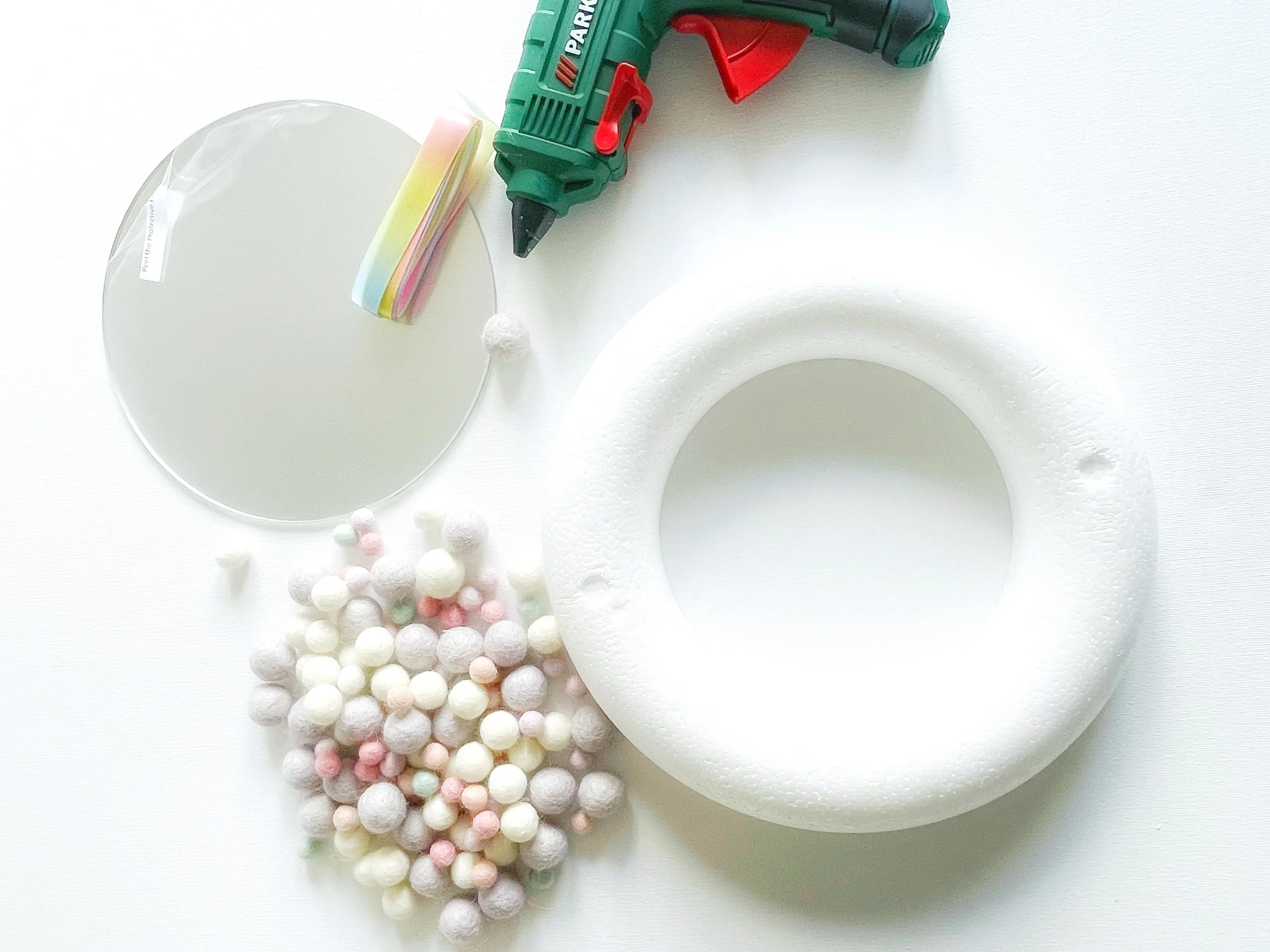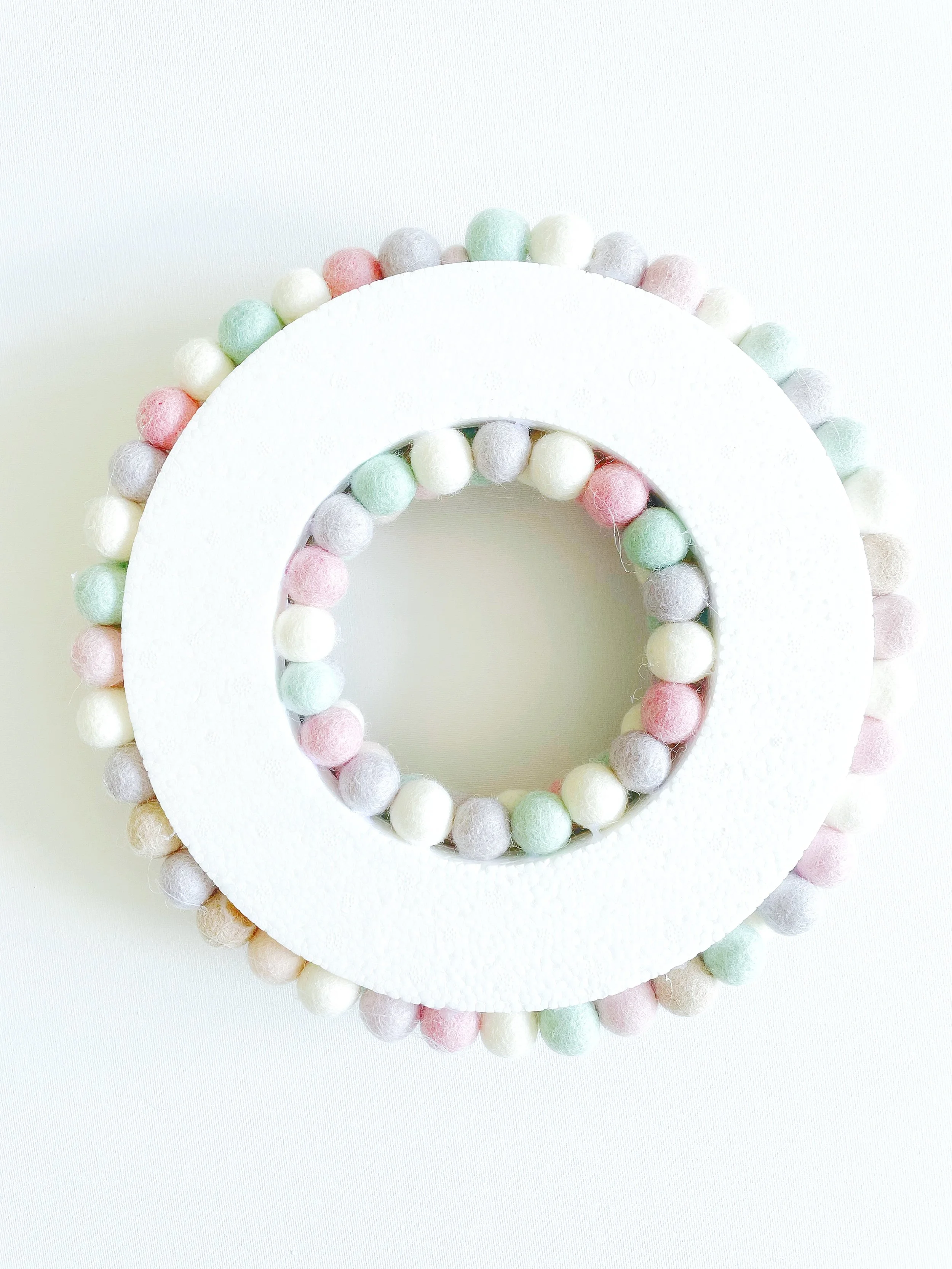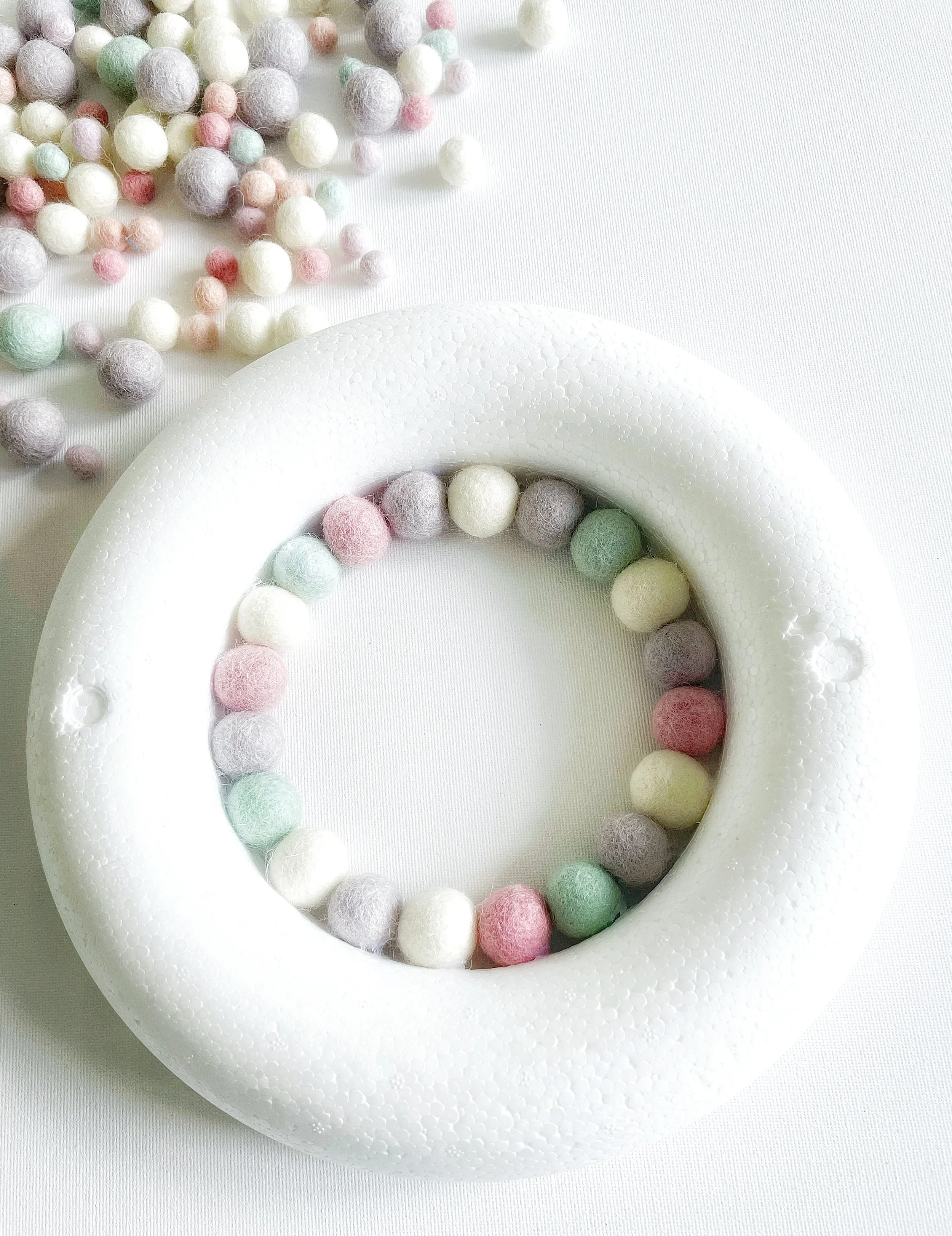 It’s super important to start with your polystyrene ring lying flat on your work surface. Do not to pick it up while you’re gluing. The felt balls need to be attached while the ring is flat.