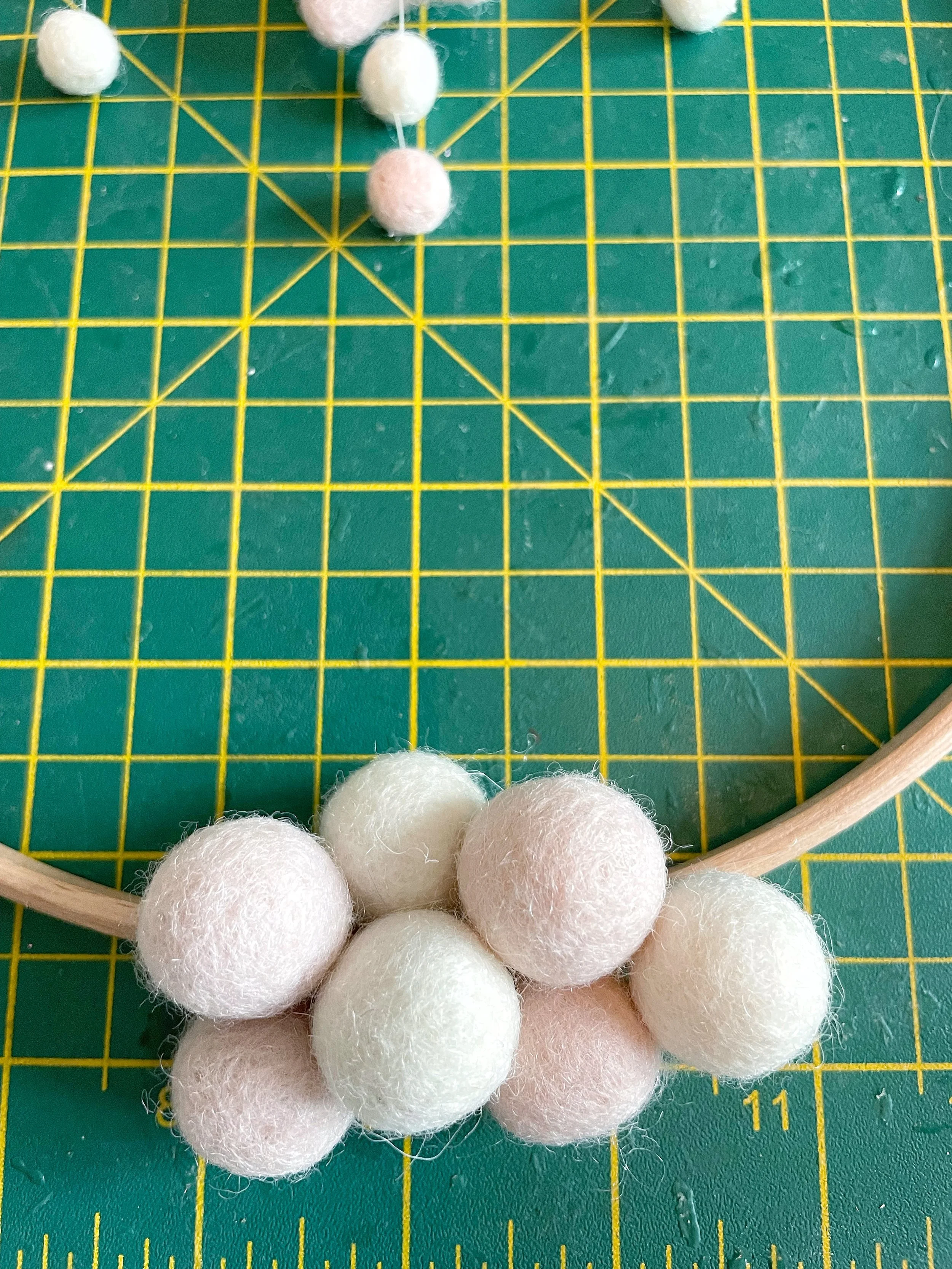 Then move on to the next felt ball… and the next… and the next, you get the idea! Before long, your hoop will be beautifully covered.