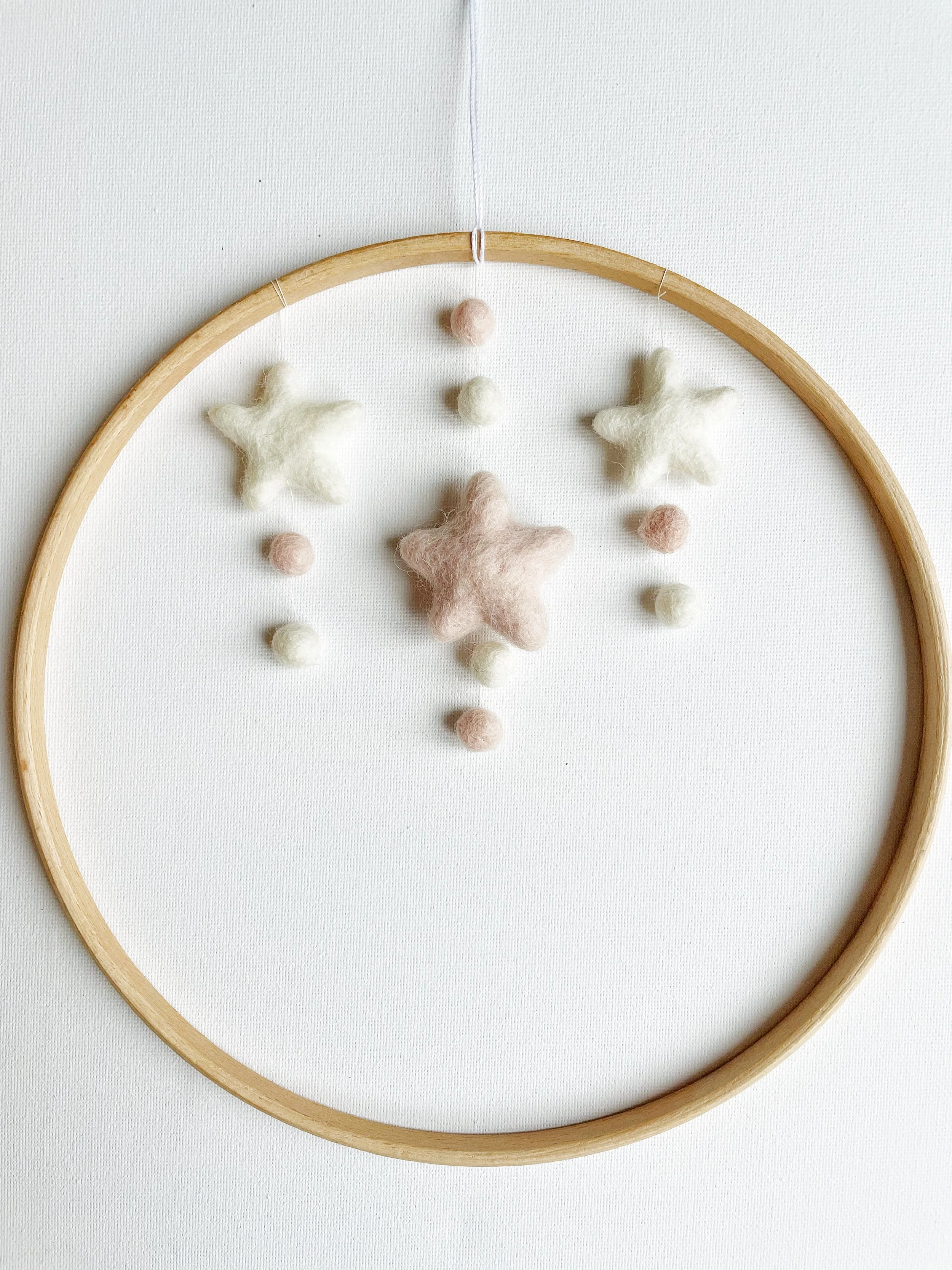 1st & 3rd strand: Start with a star ½ inch from the hoop. Add the first felt ball ½ inch below the star, then a second felt ball ½ inch below the first.