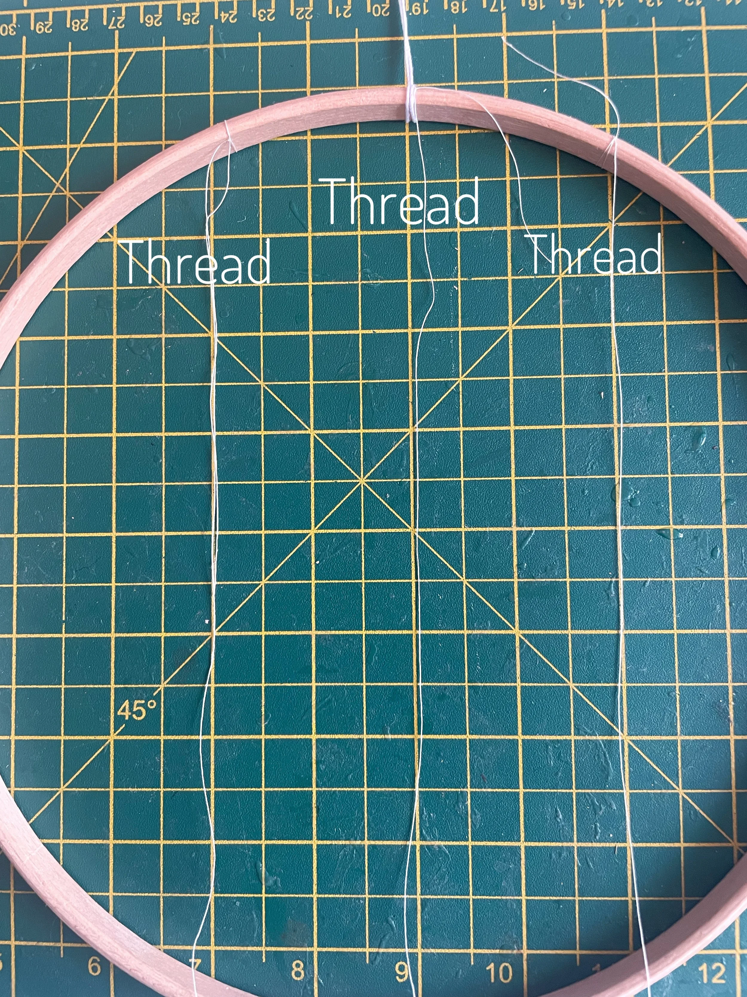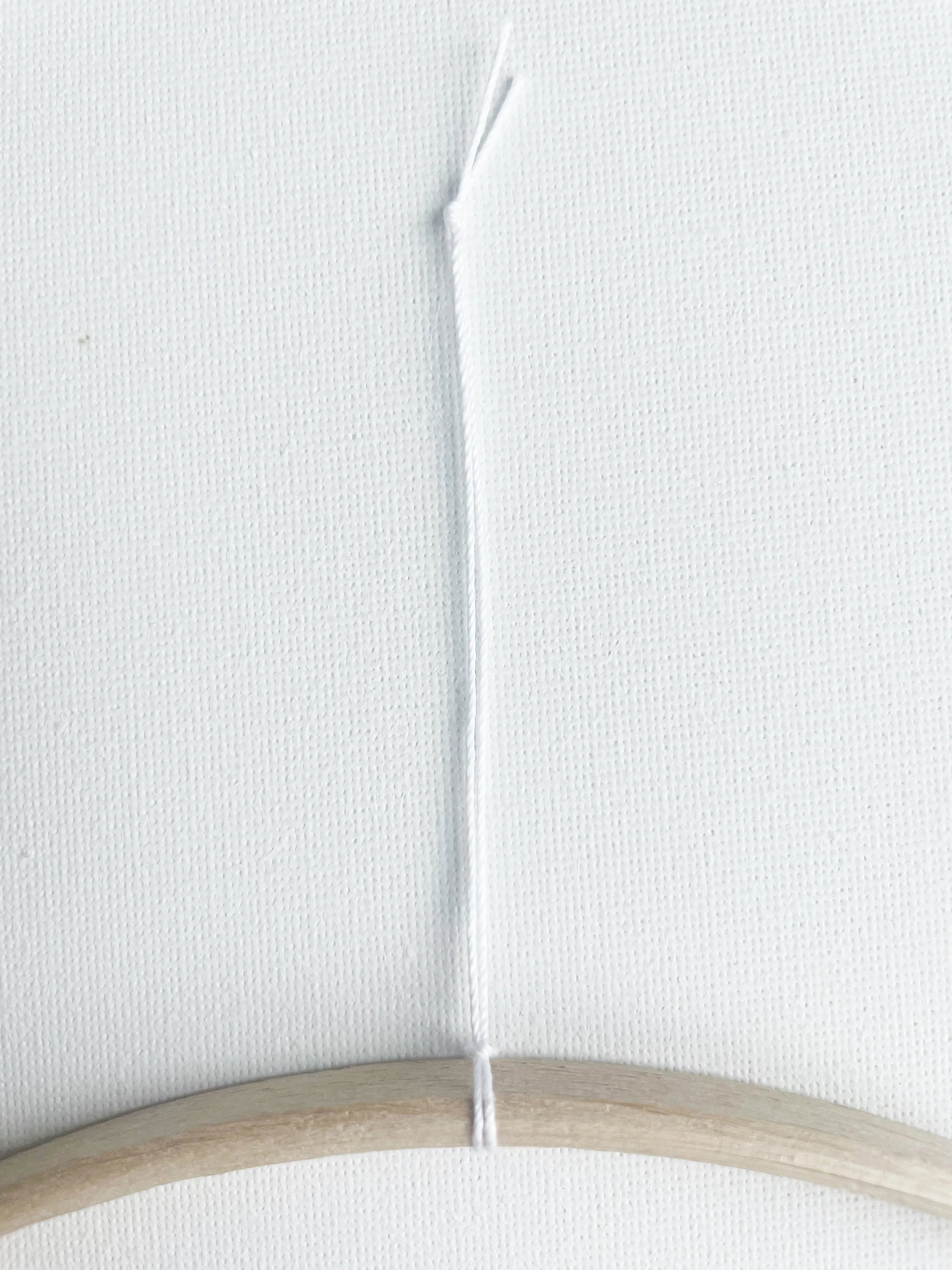 Cut a strand of thread about 9 inches long and tie it securely to the centre of the hoop, right next to the hanging loop.