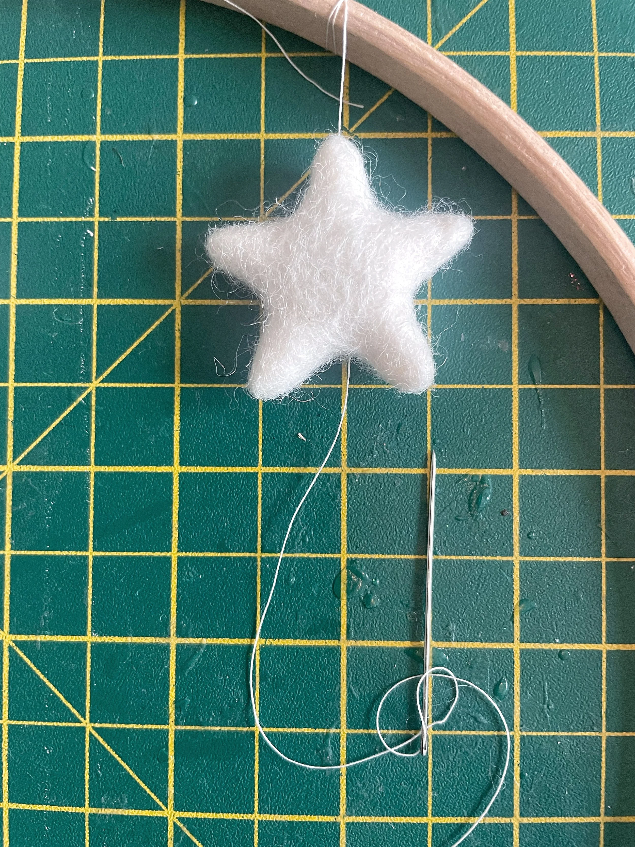 To keep it in place, use your needle to make a small knot at the base of the star (you can see how this looks in the images below). This will stop it from slipping down the thread.